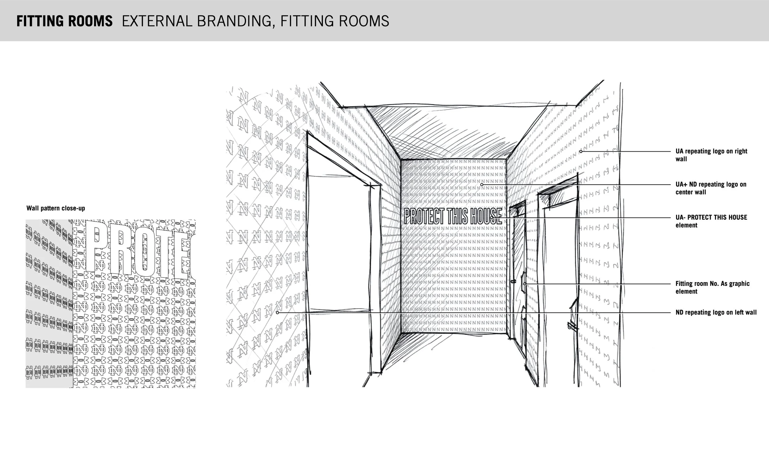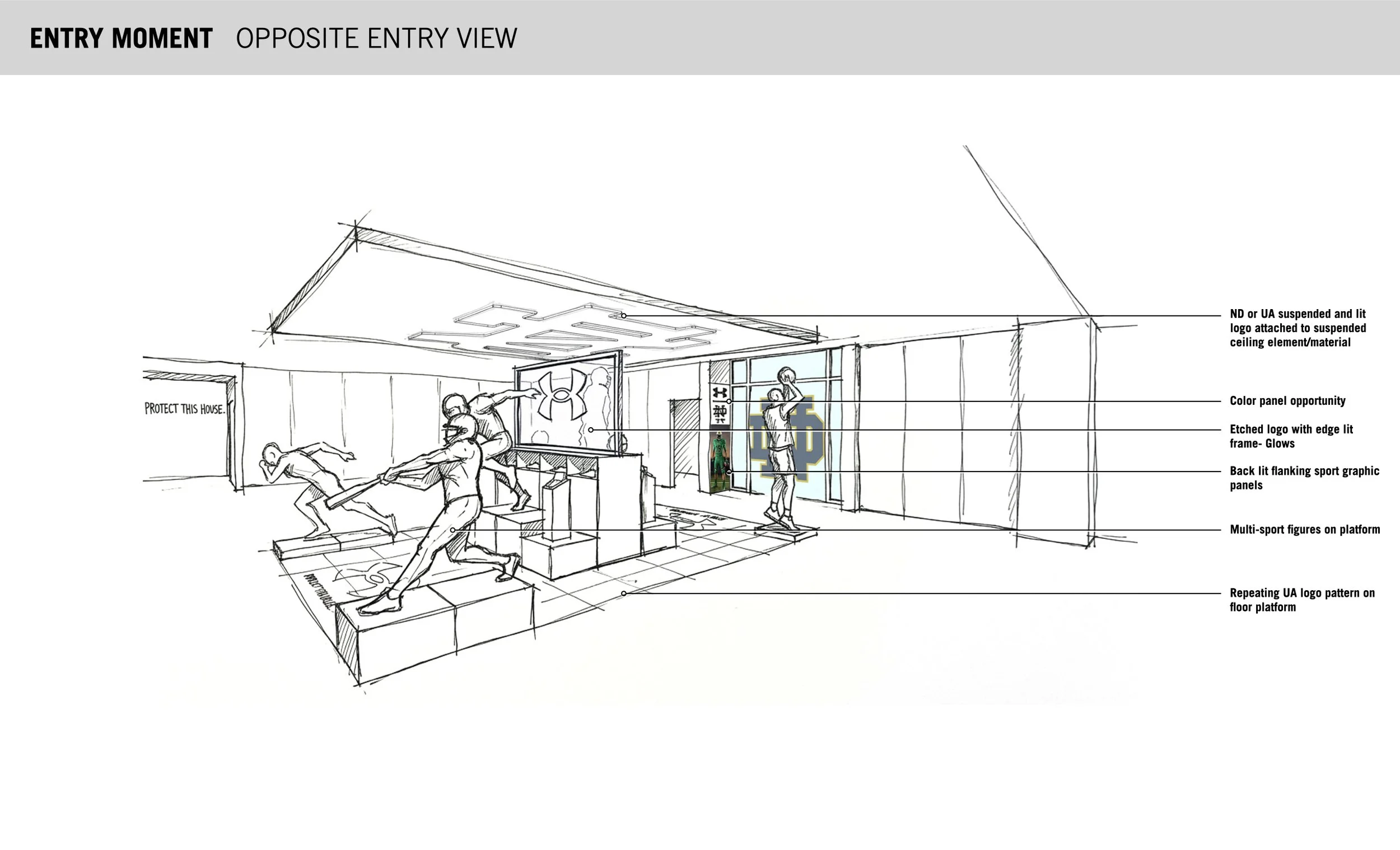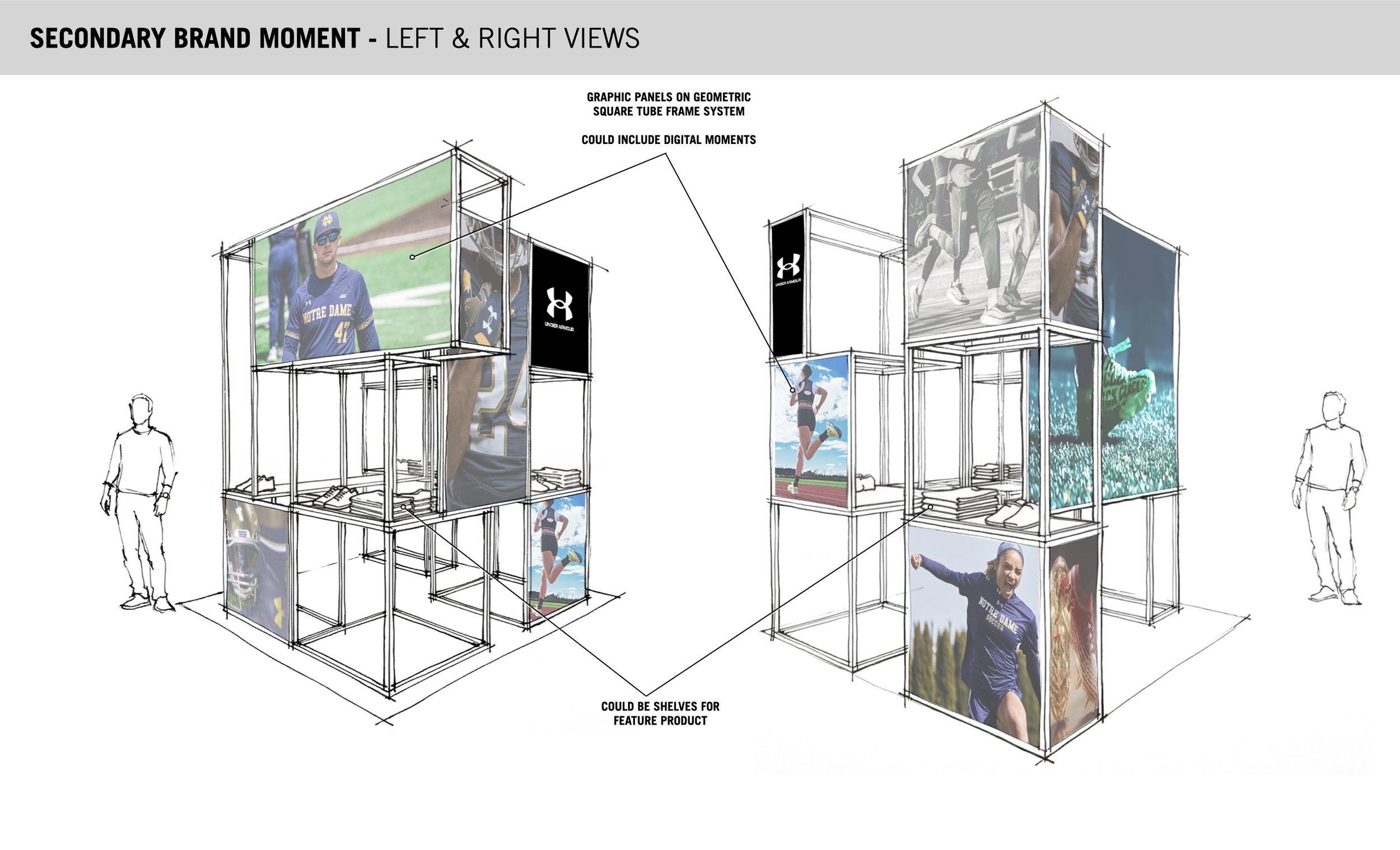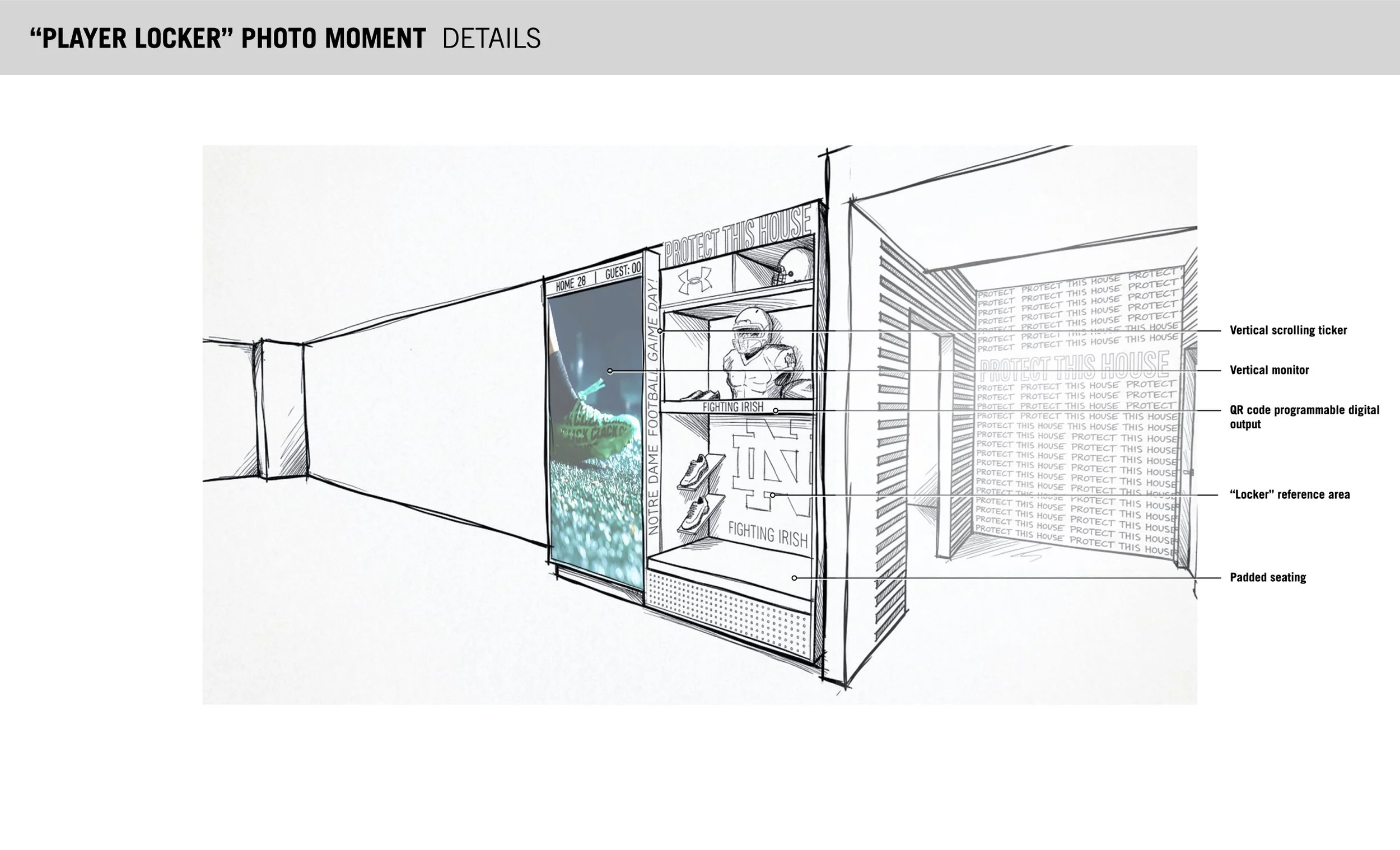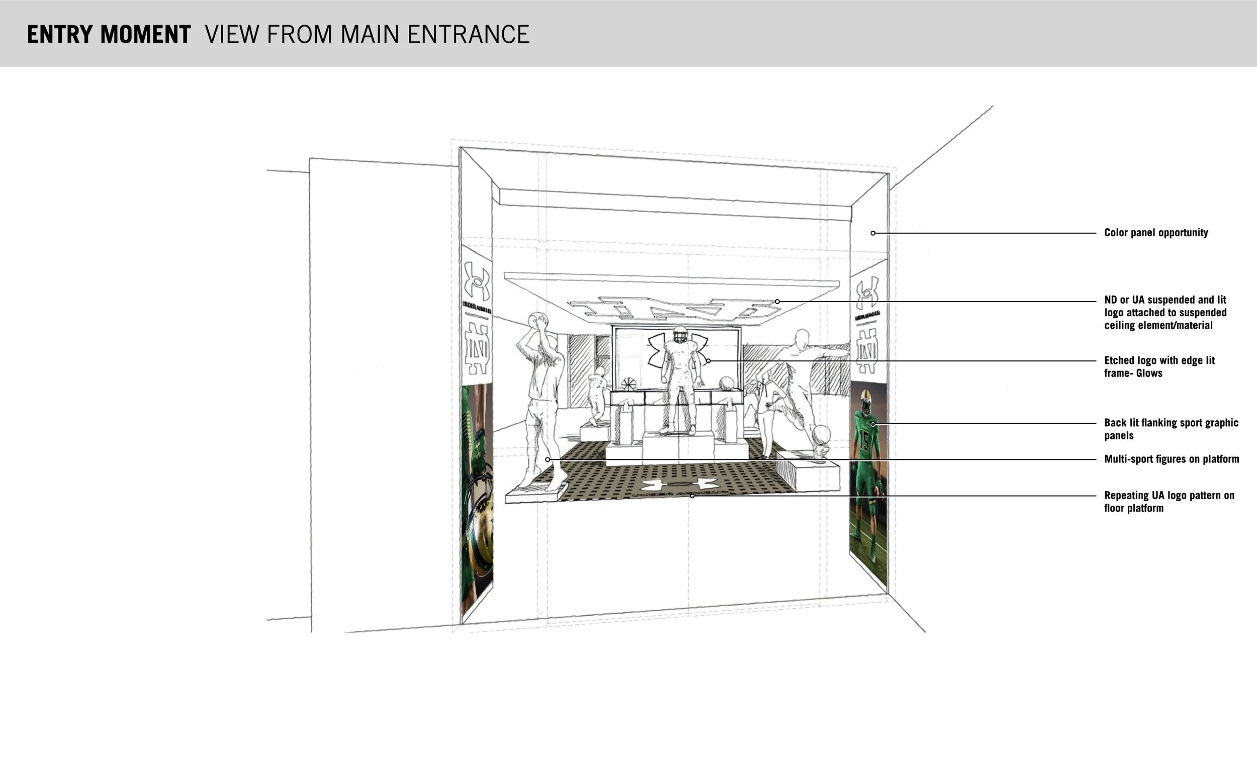 Leading creative direction for Under Armour's experiential partnership with Notre Dame, developing immersive branded environments across key touchpoints including entrance activations, a themed Locker Room experience, and interactive fitting concepts. Early concept sketches developed using AI-assisted visualization tools. Work in progress.
